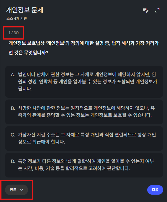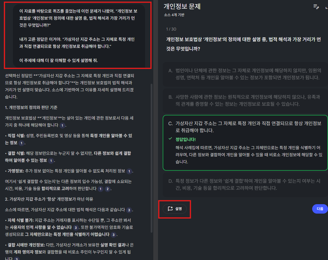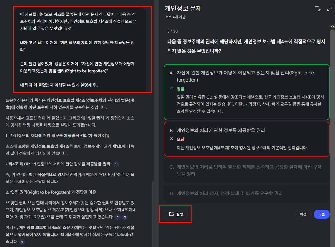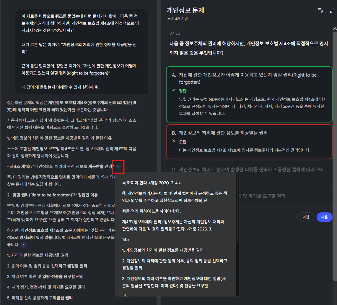 실물 도서의 경우 오답 노트를 도서의 설명에만 의존할 수밖에 없고 시간이 지나면 법령이 바뀌면서 최신 문제가 아니게 되는 문제가 생길 수 있는데, NotebookLM은 이러한 단점을 보완해 준다.