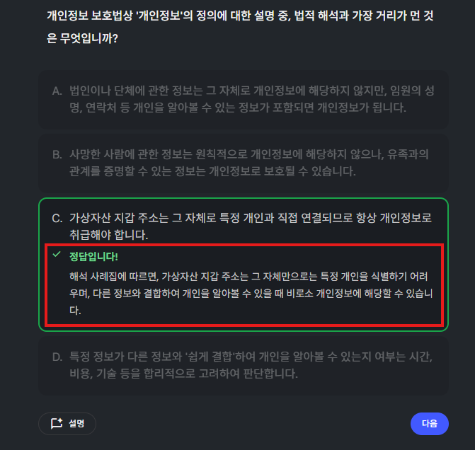 정답이라고 생각되는 문항을 클릭하면 이렇게 정답 여부와 정답인 경우 이유에 대해 설명해 준다.