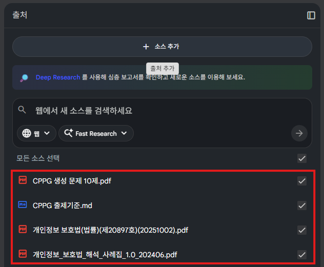 만약 이 공부법을 활용할 예정이라면 비공개 개인 노트북을 만들고 CPPG 학습을 위한 모든 자료를 source로 추가하면 된다.