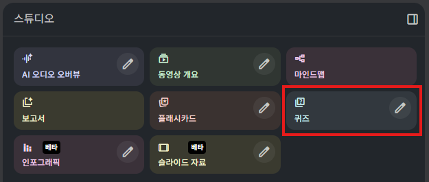 NotebookLM에 다양한 기능이 있는데, 그중에서 가장 핵심적인 기능은 '퀴즈' 생성이다.