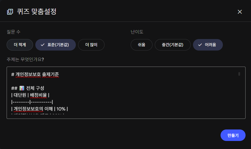 퀴즈 맞춤설정에 들어가서 '주제는 무엇인가요?' 부분에 source로 제공된 'CPPG 출제기준.md' 내용을 복사해서 붙여 넣기 한다.